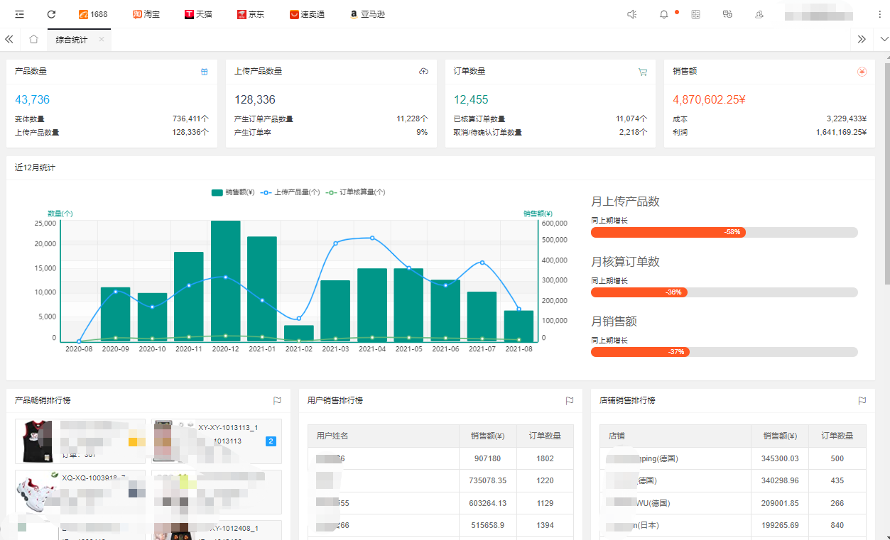 產品管理功能包括一鍵采集、批量刊登、一鍵下架及關鍵詞查詢等